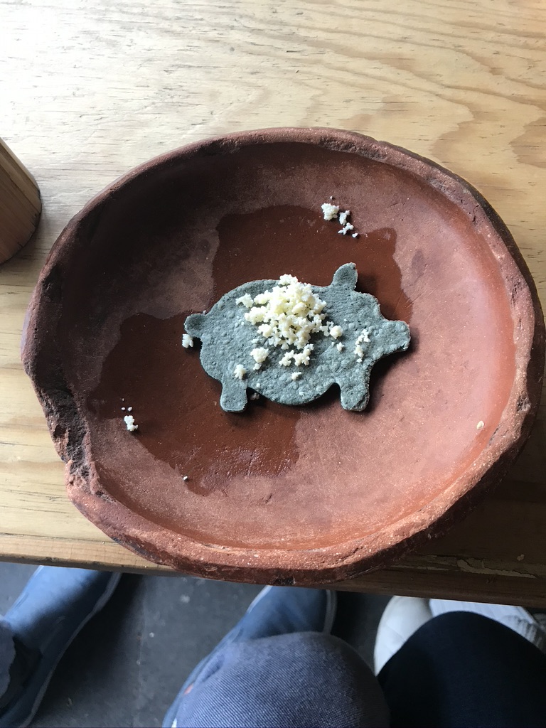 By the time we left the museum, we were very tired and hungry so we began the walk towards our dinner spot. Expendio de Maíz Sin Nombre is an experimental kitchen, composed of an volcanic rock open kitchen, two tables, and a meeting place where you can learn all about the origin of corn (designed by architect Ludwig Godefroy). Everything is made with corn, accompanied by two or three different sauces. Before serving you, they offer you a corn quesadilla, in the shape of a small pig with fresh cheese. There’s no menu, they just serve you plate after plate until you’re full, and rotate their options weekly. They asked us what we eat or don’t eat and they prepared some lovely dishes for us with whatever was fresh and available!